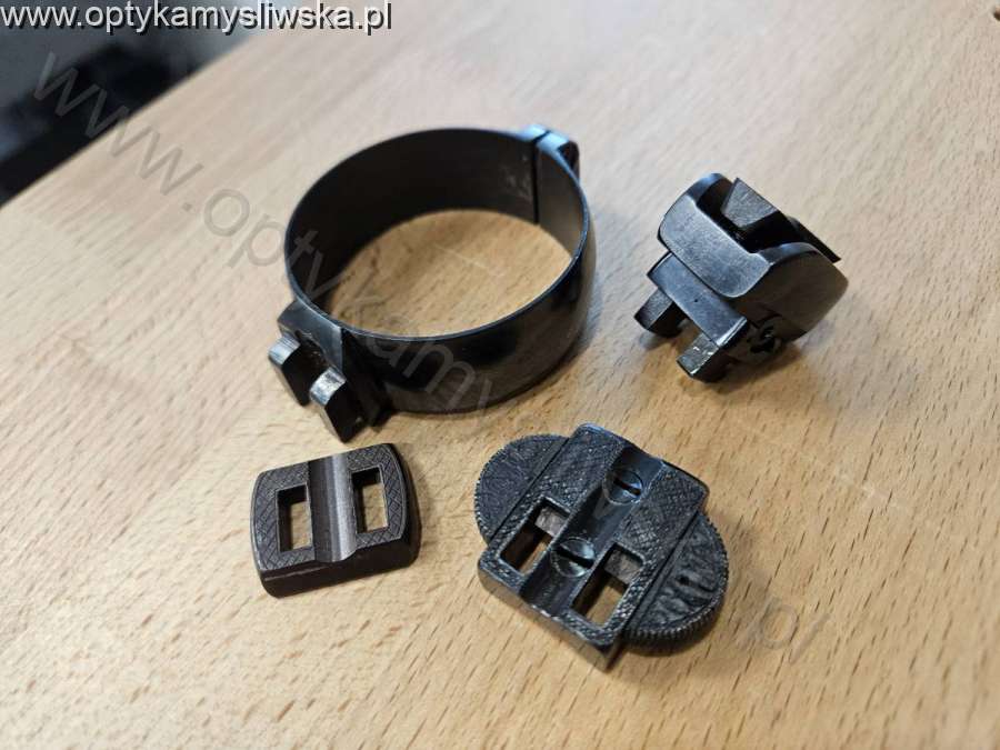 Kompletny montaż hakowy w bardzo dobrym stanie, wraz z bazami. Dla lunety o ośrednicy obiektywu 42mm z szyną wewnętrzną Zaiss ZM.