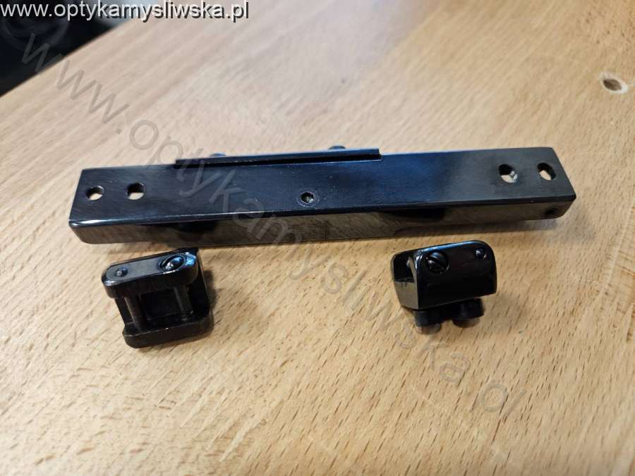 Montaż rusznikarski. Bardzo solidne wykonanie. Głęboka oksyda. Zdjęty z IZH-18MMH (szyna 11mm). Duży rygiel zabezpieczający przed przesunięciem. Uchwyty montażowe do szyny zewnętrznej lunety (szyna LM, pryzmatyczna).