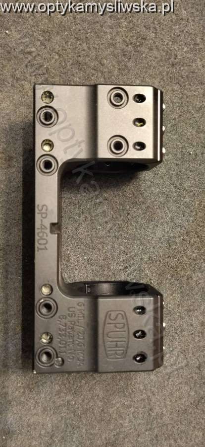 Używany monolityczny montaż szwedzkiej firmy Spuhr na tubus 34 mm pod szynę Picatinny. Dane techniczne: średnica tubusu 34 mm, pochylenie 20,6 MOA, wysokości H-38 mm oraz długości L-120 mm. W podstawę montażu wbudowana poziomnica. W komplecie instrukcja i 4 zapasowe śruby do pierścieni.