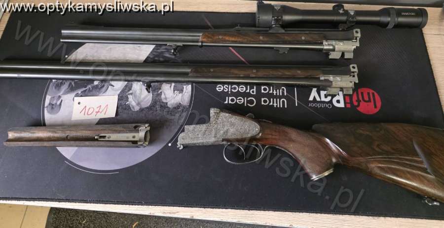 Rusznikarska Kniejówka na bazie Merkel 201. Renomowana rusznikarnia Połap i Syn wykonała do tej broni lufy kniejowe wraz z montażem optyki, na zamówienie wykonano kolbę z wysokiej klasy drewna, a także dodano piękne zdobienia. W komplecie lufy śrutowe w kalibrze 16/70. Wyjątkowy egzemplarz broni w świetnych kalibrach.Broń używana w doskonałym stanie technicznym.