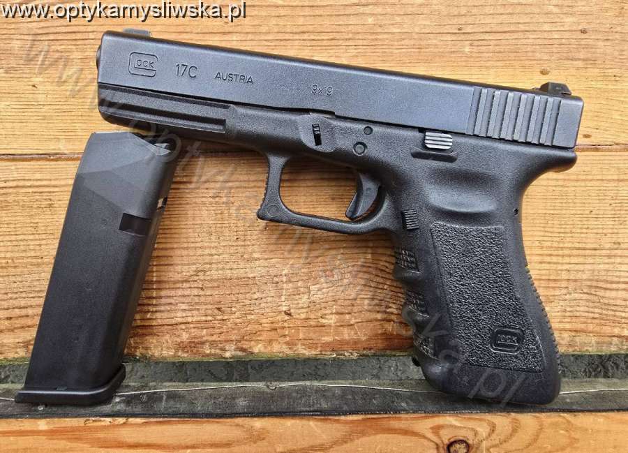 Pistolet samopowtarzalny Glock 17 C, kal. 9x19. Wersja z fabrycznym portingiem lufy i zamka. Broń po wewnętrznej ochronie firmy Glock (grawer po prawej stronie zamka). Produkcja Austria - Glock GmbH - Deutsch-Wagram - około 2014 r. Lufa lustro w stanie bardzo dobrym. Broń w oryginalnej powłoce, Generacja 3 na dwóch kołkach. Stalowe trytowe przyrządy celownicze oraz szyna. W komplecie jeden magazynek 15 nabojowy. Lokalizacja Brzoza pod Bydgoszczą. Tel. 790-280-454 - www.olimparms.pl