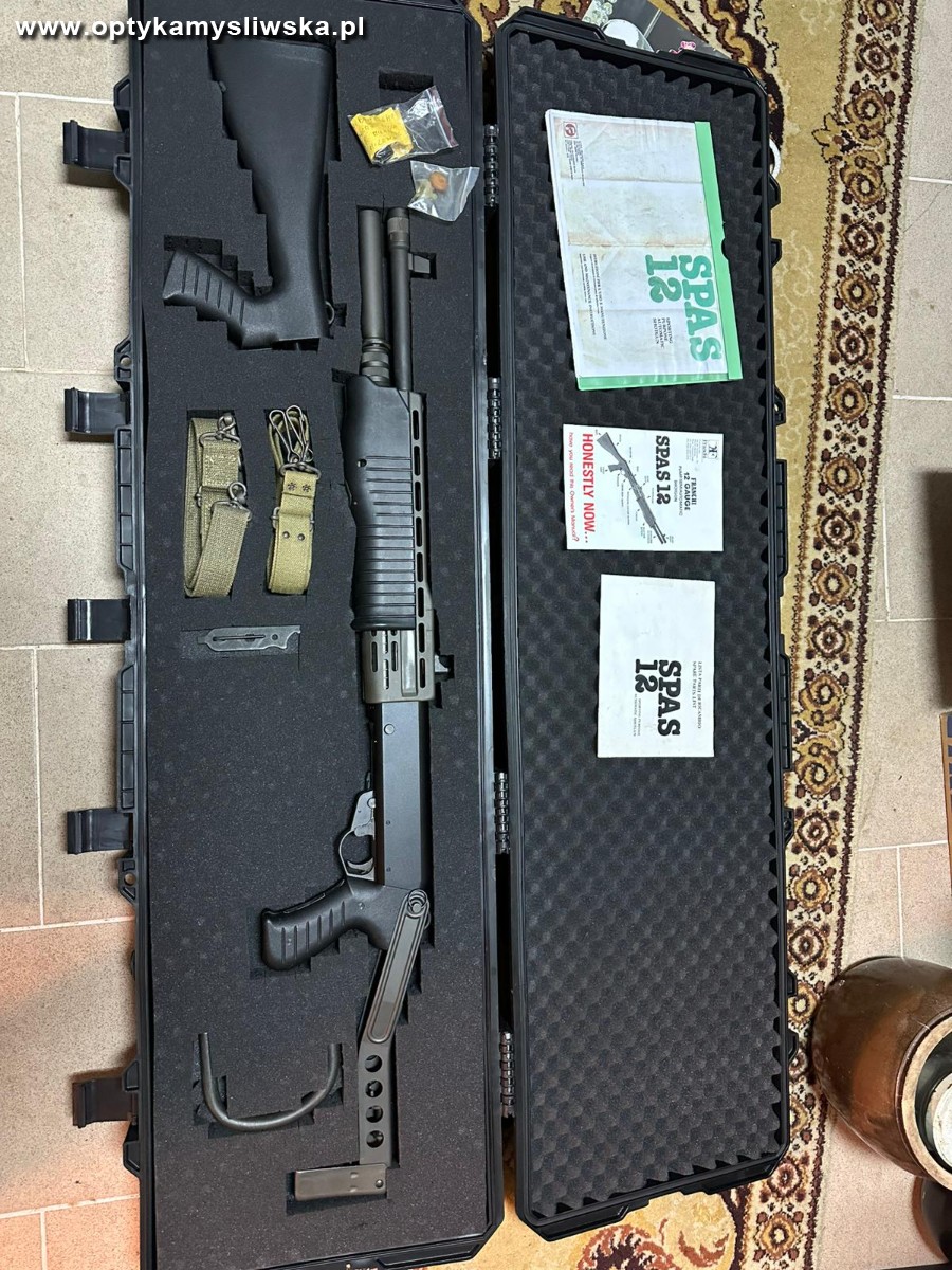 Spas 12. Lufa lustro, wczesny bezpiecznik. W zestawie oryginalny hak, buffer suwadla nieuzywany, 2 oryginalne pasy, oryginalna kolba stala, 100 szt amunicji, skrzynia, tool do rozkladania. Lufa lustro.