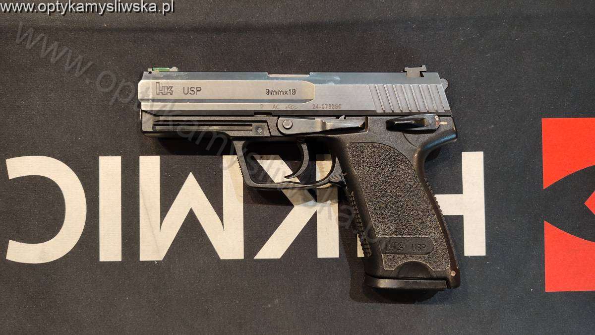 Oferujemy pistolet renomowanej firmy Heckler & Koch, model USP full size w kalibrze 9x19. Broń używana, stan techniczny bdb, widoczne otarcia na zamku. Wstawione nowe przyrządy światłowodowe marki Hi-Viz. Oryginalne przyrządy w zestawie.