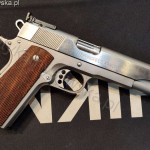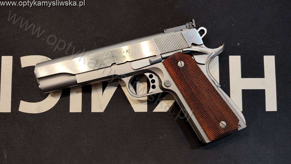 Oferujemy klasyczny pistolet M1911A1 w kalibrze 9x19 produkcji amerykańskiej firmy Springfield. Zamek i szkielet chromowane (widoczne drobne zadrapania), drewniane okładziny. Pistolet używany, stan techniczny bdb. Szczerbinka regulowana LPA.