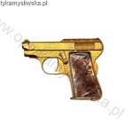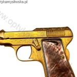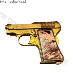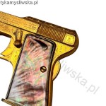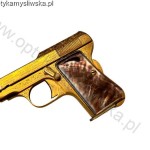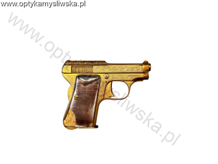 Unikalny pistolet Beretta 421 Luxus wyprodukowany w 1940 roku, w luksusowej pozłacanej wersji oraz okładzinami z masy perłowej (jedna okładzina z widocznym uszkodzeniem). Kompaktowa konstrukcja i finezyjne wykończenie czynią z niego niezwykle rzadki okaz kolekcjonerski. Model ten reprezentuje przedwojenną jakość włoskiej produkcji – zgrabny, precyzyjny i elegancki. Egzemplarz w pełni sprawny, z zachowaną oryginalną stylistyką.