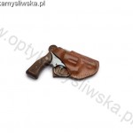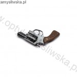Rewolwer centralnego zapłonu Rossi Mod.82, kal.. 38 Special. Rewolwer silnie przypominający ponadczasowy rewolwer Smith&Wesson Mod. 36 - ulubioną broń detektywów i agentów FBI do skrytego noszenia, co wynika ze wspólnej historii obu producentów. Rewolwer o charakterze kolekcjonerskim, jednak z zachowaniem pełnych walorów użytkowych. Posiada niemieckie znaki akceptacyjne z 1990r.Stan bardzo dobry. Oksyda w stanie bardzo dobrym - lustrzana, poza drobnymi wytarciami na dole grzbietu rękojeści, brak jakichkolwiek zarysowań, wytarć i uszkodzeń (widoczne nierównomierności koloru oksydy pochodzą od pozostałości oleju do broni). Przewód lufy w stanie bardzo dobrym, potwierdzony badaniem boroskopem Hawkeye. Okładki rękojeści z drewna egzotycznego w stanie bardzo dobrym minus - widocznych kilka kosmetycznych wgnieceń, brak zarysowań i wytarć. W pełni stalowa konstrukcja, pięciokomorowy bęben nabojowy. Mechanizm spustowy DA/SA. Rewolwer sprawny, po przeglądzie rusznikarskim i testach na strzelnicy w trybie samonapinania i bez samonapinania. W zestawie skórzana kabura w stanie dobrym - bez wad i uszkodzeń. Wymiary: 17,3x11cm.