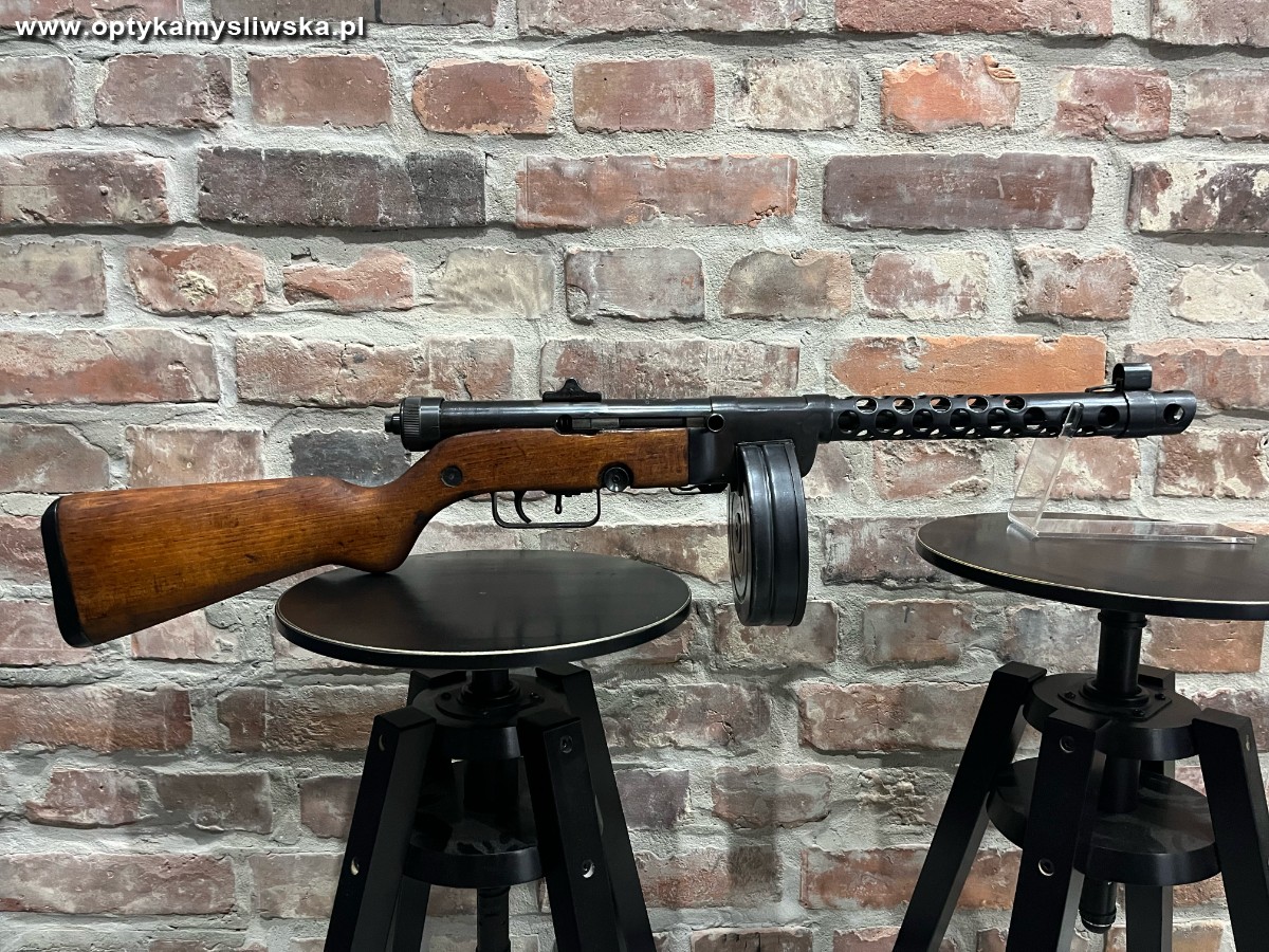 Pistolet samopowtarzalny Zastava M49/57, kal. 7,62x25. Broń w oryginalnej oksydzie w stanie bardzo dobrym. Broń strzela jak w oryginale z zamka otwartego. Produkcja Jugosłowiańska. Przewód lufy w stanie bardzo dobrym - lustro. W komplecie jeden magazynek bębnowy 71 nabojowy. Zbliżony wygląd do PPSz wz. 41, magazynki są wymienne z magazynkami PPSz, zarówno łukowe jak i bębnowe. Błyskawiczna wymiana lufy podobnie jak w MG 42/53, wystarczy przy otwartym zamku wcisnąć zapadkę przy muszce i obrócić lufę 90 stopni, po czym lufę można wyciągnąć z broni. Produkt koncesjonowany, dostępny za okazaniem odpowiednich dokumentów.