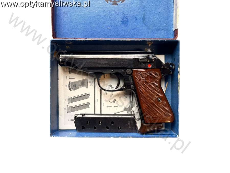 Klasyk w poszukiwanym, licencyjnym wydaniu – Walther PP wyprodukowany przez francuską firmę Manurhin. Pistolety z tej fabryki słyną z bardzo dobrejj jakości wykonania, według wielu często przewyższającej niemieckie odpowiedniki. Model PP to kamień milowy w historii broni, który wprowadził niezawodny mechanizm DA/SA i przez dekady służył w policjach całej Europy. Kaliber 7,65 mm Browning. Egzemplarz w stanie bardzo dobrym minus, w komplecie z pudełkiem i dodatkowym magazynkiem. Świetna propozycja dla koneserów.