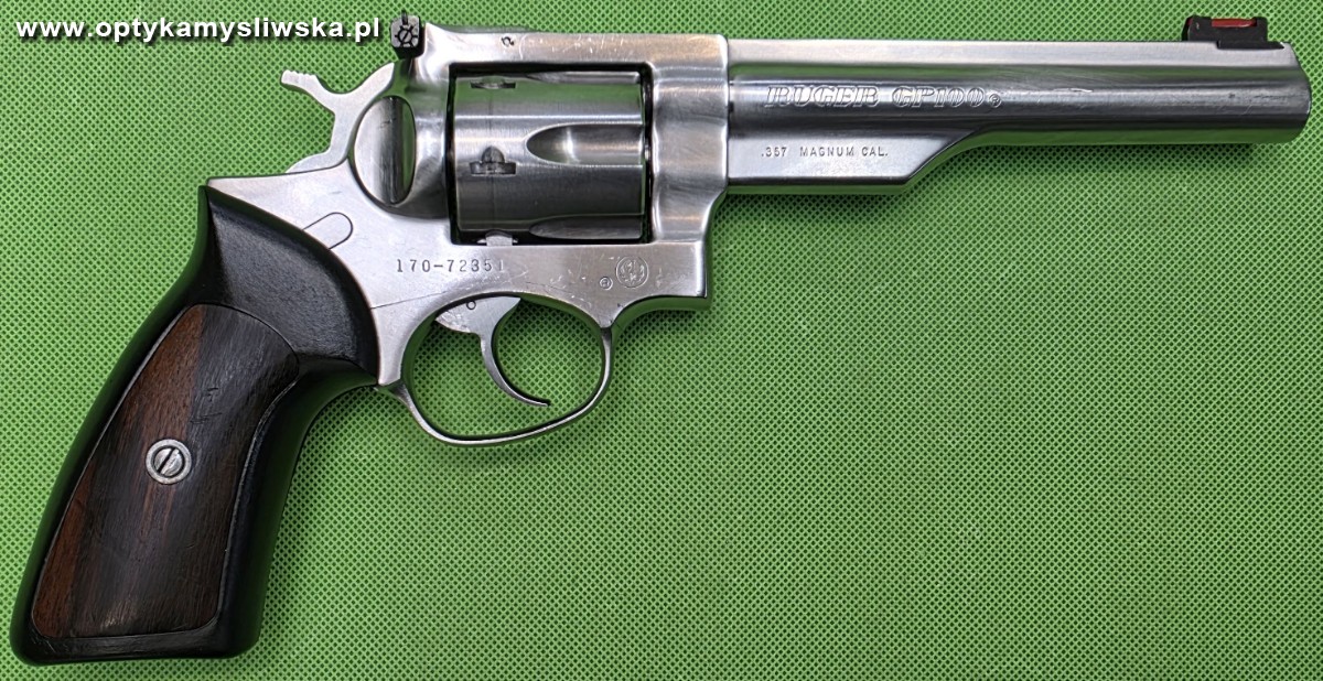 Najwyższej jakości amerykański rewolwer ze stali nierdzewnej z lufą 6″. GP100 jest uznawany za jeden z najmocniejszych rewolwerów na średnim szkielecie, jakie kiedykolwiek wyprodukowano. Szkielet ten stanowi jeden element, co istotnie odróżnia rewolwery Rugera od S&W, czy Colta. Rozwiązanie to zwiększą wytrzymałość i trwałość broni, a to ma zasadnicze znaczenie przy stosowaniu silnej amunicji magnum. Oferowany egzemplarz został wyprodukowany w 1988 r. ale nadal znajduje się w doskonałym stanie technicznym oraz wizualnym. Lufa oczywiście nieskazitelna.