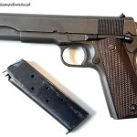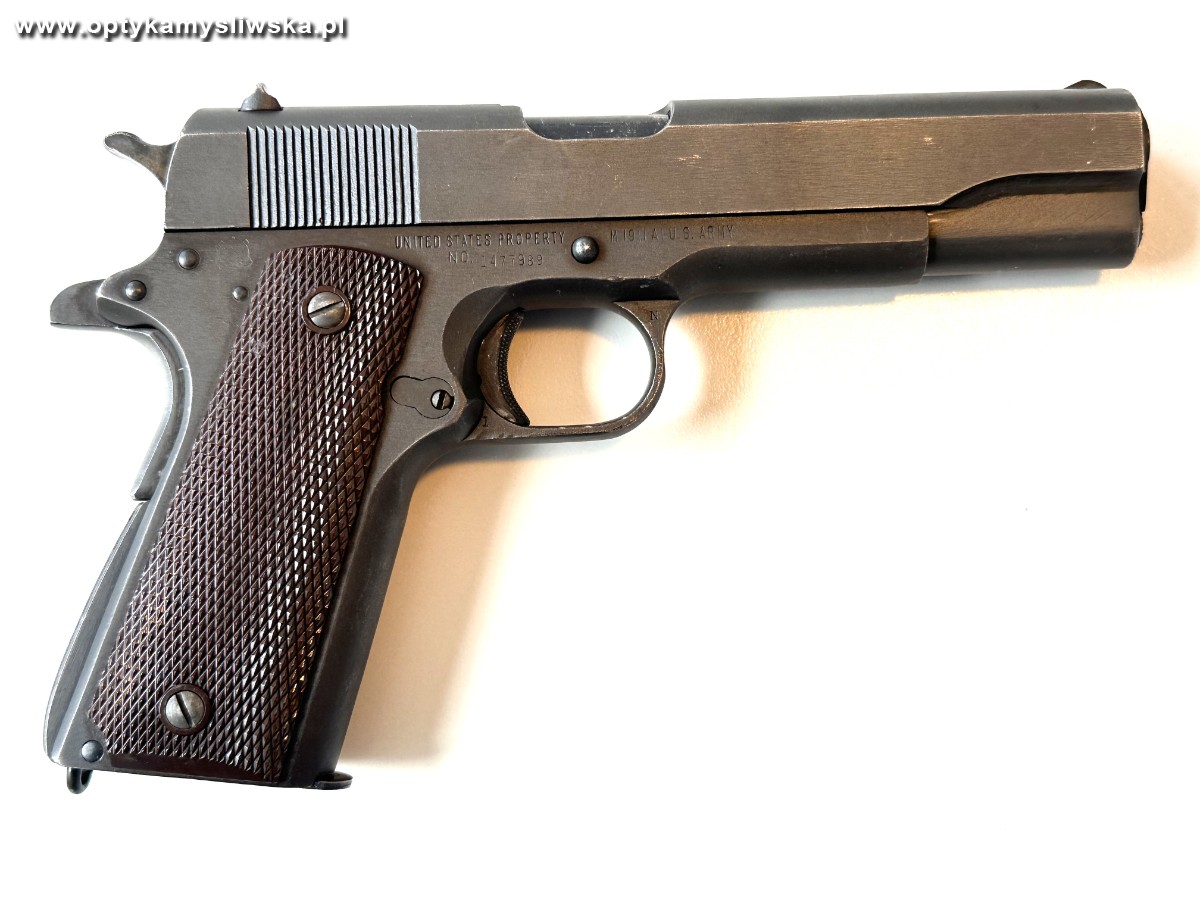 REMINGTON RAND M1911A1, cal. 45ACP, numer wskazuje na produkcję z 1943r. Stan bardzo dobry: ponad 95% oryginalnej parkeryzacji, przewód lufy fabryczny. Zamek i szkielet od jednego kompletu, pistolet nie kombinowany i nie remontowany, zatem nie posiada żadnych oznaczeń powojennych. Wszystko podręcznikowo (lufa High Standard, magazynek z literką G). Nie strzelany, czysto kolekcjonerski egzemplarz. Warszawa i cała Polska tel. 604 955 75zero, mail: maciek02814@wp.pl