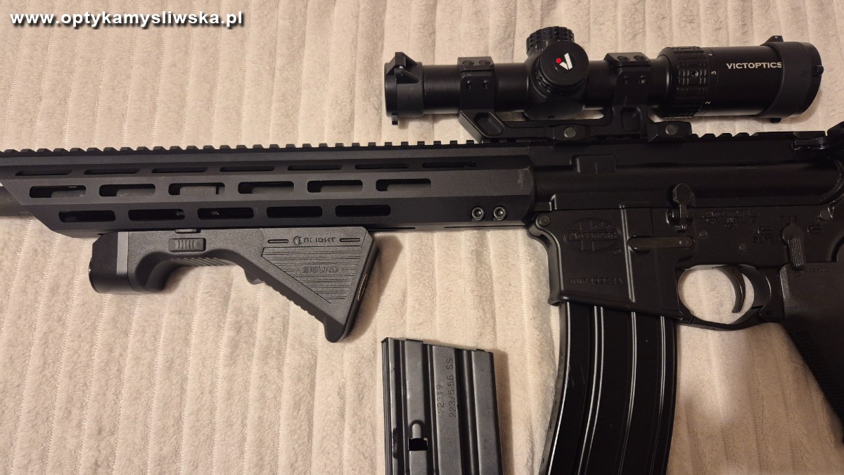 Karabinek AR-15 Mossberg MMR kal. 223 Rem, AR-15 kupiony rok temu, doposażony w pas jednoczęściowy, dodatkowy magazynek, lunetę celownicza Victoptics S6 1-6x24 oraz latarkę taktyczną na broń z chwytem przednim Olight Sigurd 1450 lm. Dodatkowo do broni dokładam całość aminicji ok. 350 sztuk. Karabin odwiedził może 3 razy strzelnice i przepuścił max 400 sztuk amunicj. Cena za broń uczciwa bo same dodatki warte są ok. 2000 złotych. Pozbywam się karabinu bo powoli wyprzedaję kolekcję.