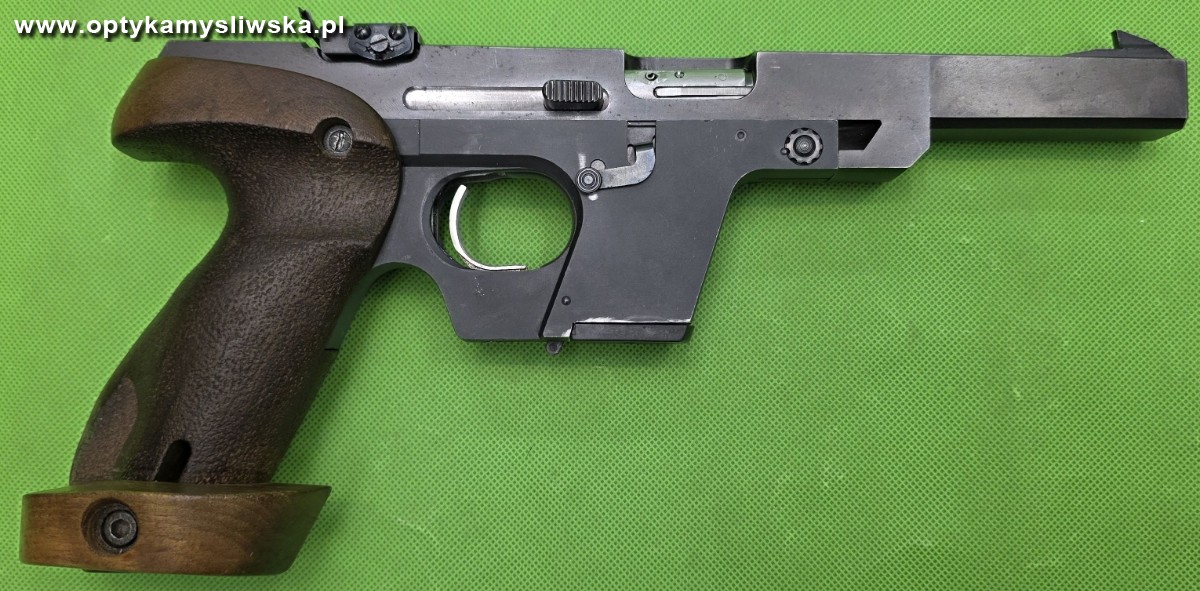 Najwyższej klasy legendarny, niemiecki pistolet wyczynowy, wprowadzony na rynek w 1968 r. i produkowany z różnymi modyfikacjami po dziś dzień. Oferowany egzemplarz pochodzi z 1974 r. a więc jest wczesnym wariantem, różniącym się od późniejszej produkcji między innym: konstrukcją zamka, kształtem komory zamkowej i lufy, a także bezpiecznikiem nastawnym, z którego ostatecznie Walther zrezygnował w 1977 r. Chwyt z regulowaną półką w rozmiarze M. Pistolet nosi normalne oznaki używania, adekwatne do wieku. Technicznie jednak broń znajduje się w bardzo dobrym stanie, jest w 100 % oryginalna i zgodna numerycznie. Lufa nieskazitelna. W komplecie jeden magazynek, także wczesnej wersji – z metalowym donośnikiem.