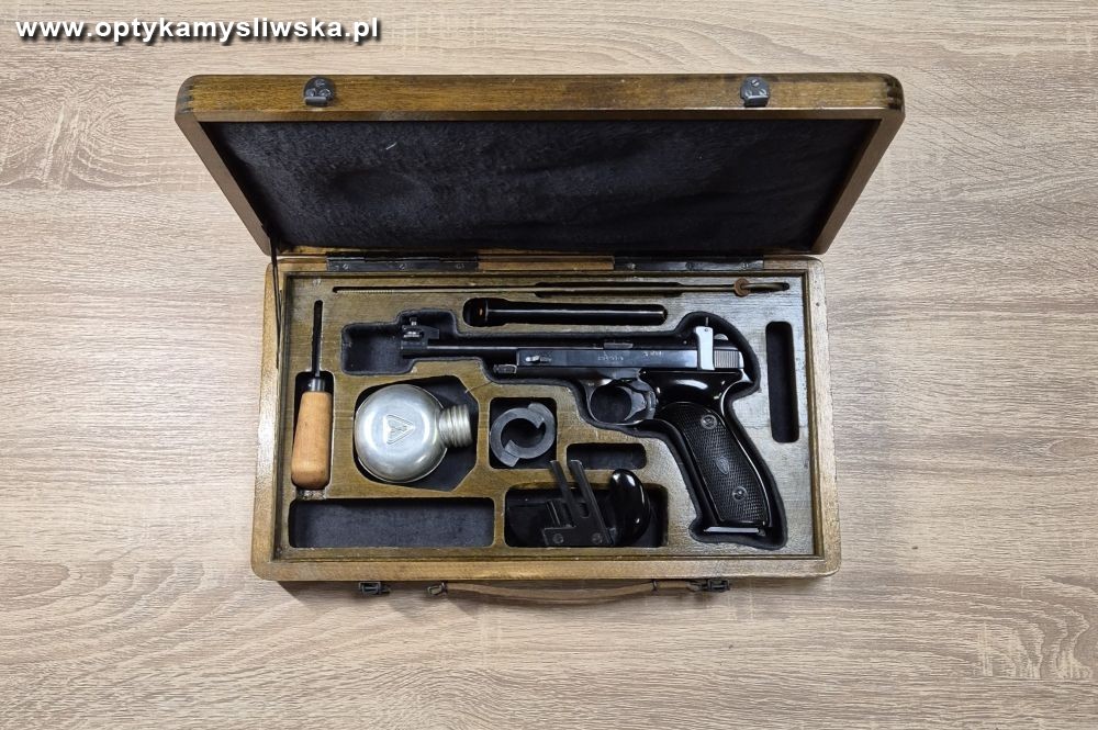 Pistolet sportowy Margolin kal. 22LR - zestaw jak na zdjęciach. Oryginalna walizka, dodatkowy magazynek, wycior, śrubokręt, olejarka, podpórka rękojeści, oraz dwa obciążniki które niestety nie są kompatybilne. Stan techniczny BDB. Na broni widoczny niemiecki atest z 1973r. Polecam.