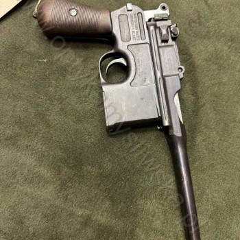 Pistolet Mauser C96 kal. 7,63mm Mauser. Ładny stan widoczny na zdjęciach, zgodny numerycznie w komplecie z oryginalną kaburokolbą. Wnętrze lufy bdb.