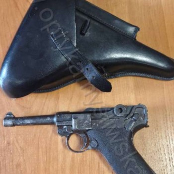 Pistolet Parabellum 1908 kal. 9mm Para (9x19), oryginalna kabura, zapasowy magazynek. Stan broni widoczny na zdjęciach, ale sprawna.